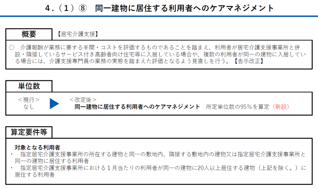 - 同一建物の居住者についての減算に、たとえ事業所とは別の建物であっても、その建物内に20人以上居住している場合は、減算の対象となりました。