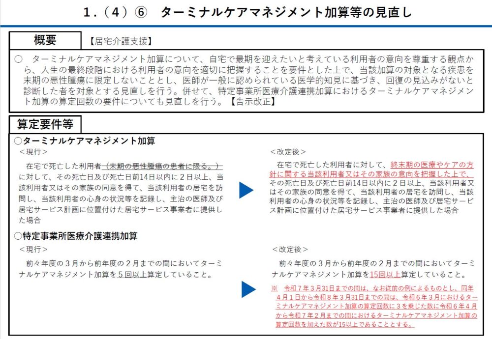 令和6年度の介護報酬改定では、対象となる疾患が「末期の悪性腫瘍に限定しない」こととなり、「医師が一般に認められている医学的知見に基づき、回復の見込みがないと診断された者」が対象となりました。